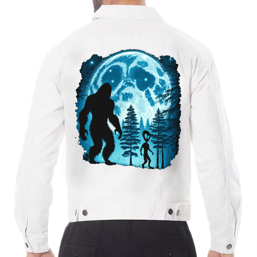Bigfoot Moon Men’s White Denim Jacket – Cool Denim Jacket for Men – Printed Denim Jacket