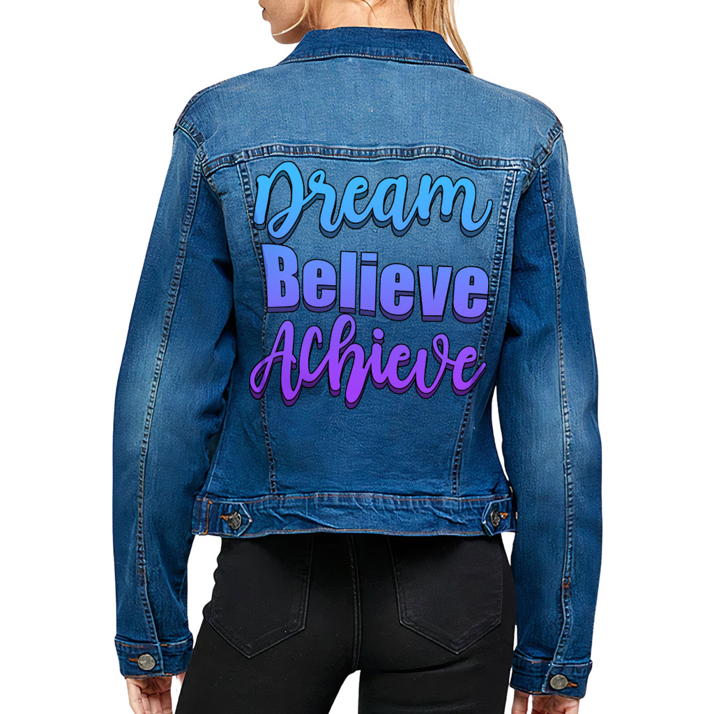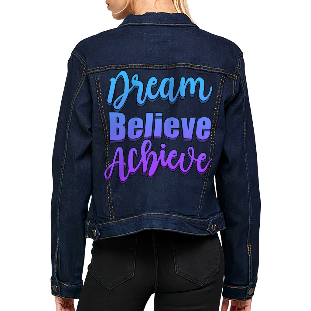 Dream Believe Achieve Women’s Denim Jacket – Inspirational Ladies Denim Jacket – Graphic Denim Jacket