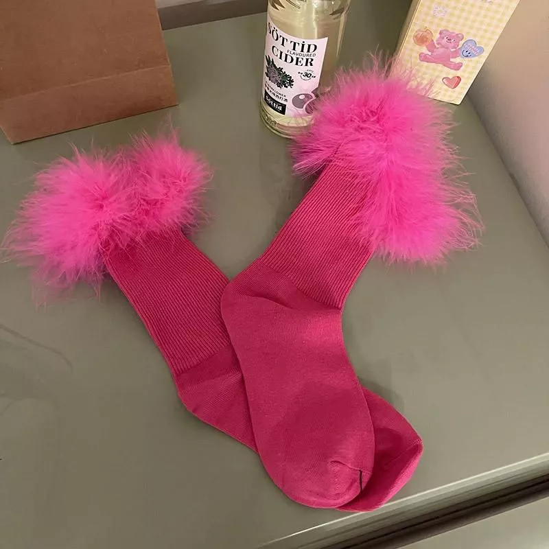 - Unique Design: Featuring a charming rose pink hue and adorned with soft feather fur, these socks are sure to turn heads and spark conversations.