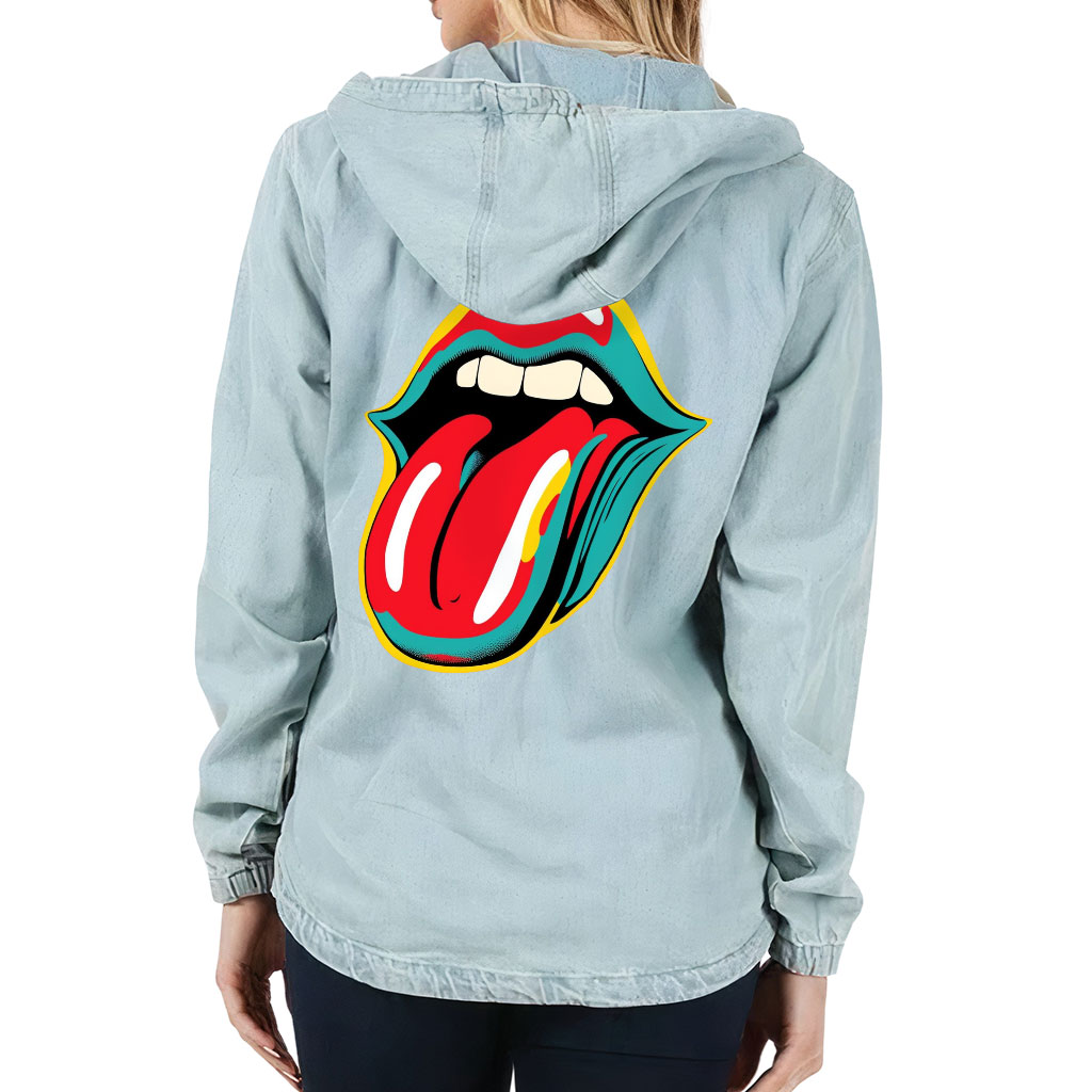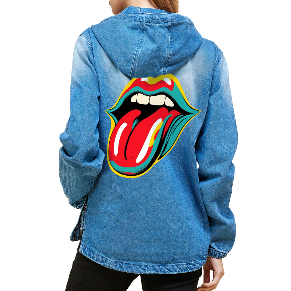 Rock and Roll Women’s Denim Jacket with Hoodie – Cool Ladies Denim Jacket – Trendy Graphic Denim Jacket