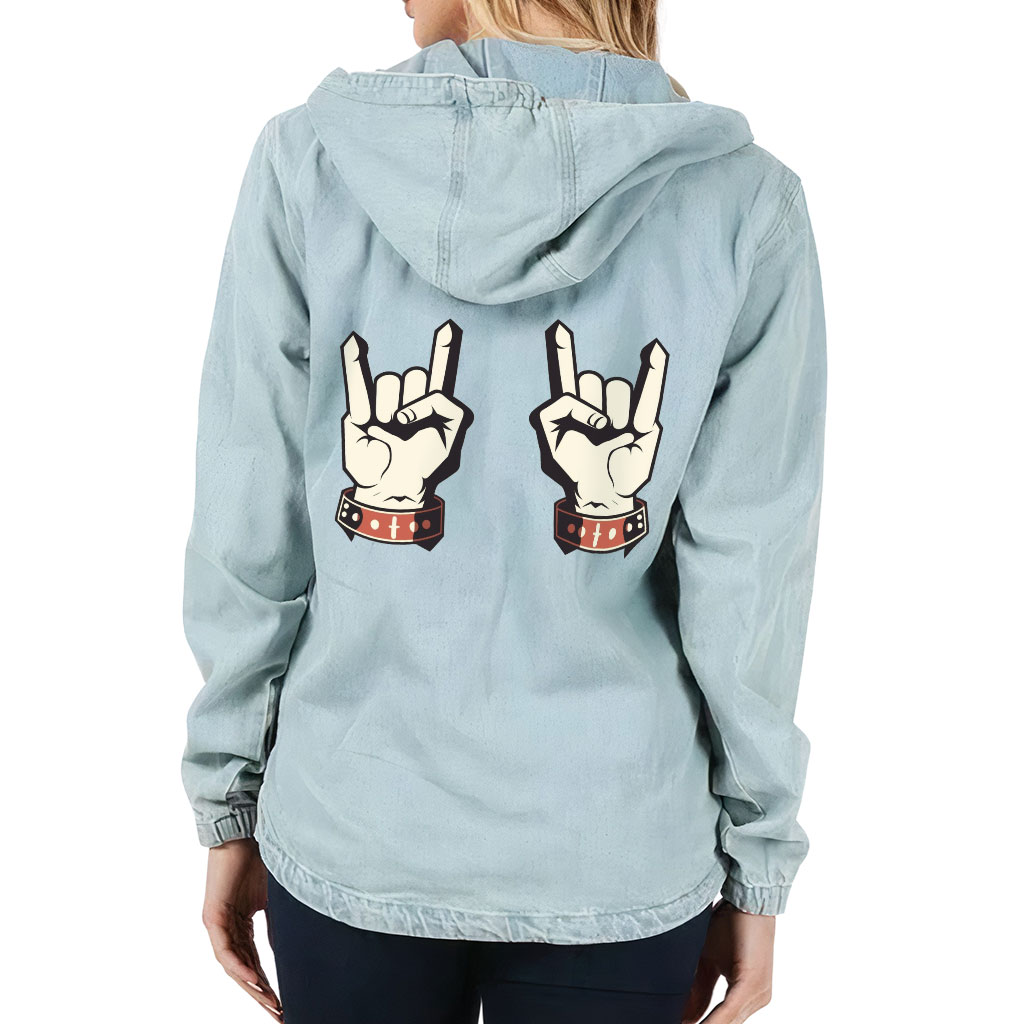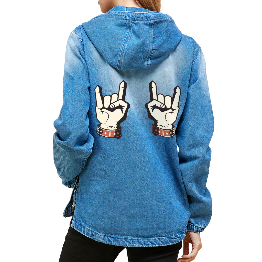 Rock Hand Women’s Denim Jacket with Hoodie – Rock ‘n’ Roll Ladies Denim Jacket – Cool Design Denim Jacket