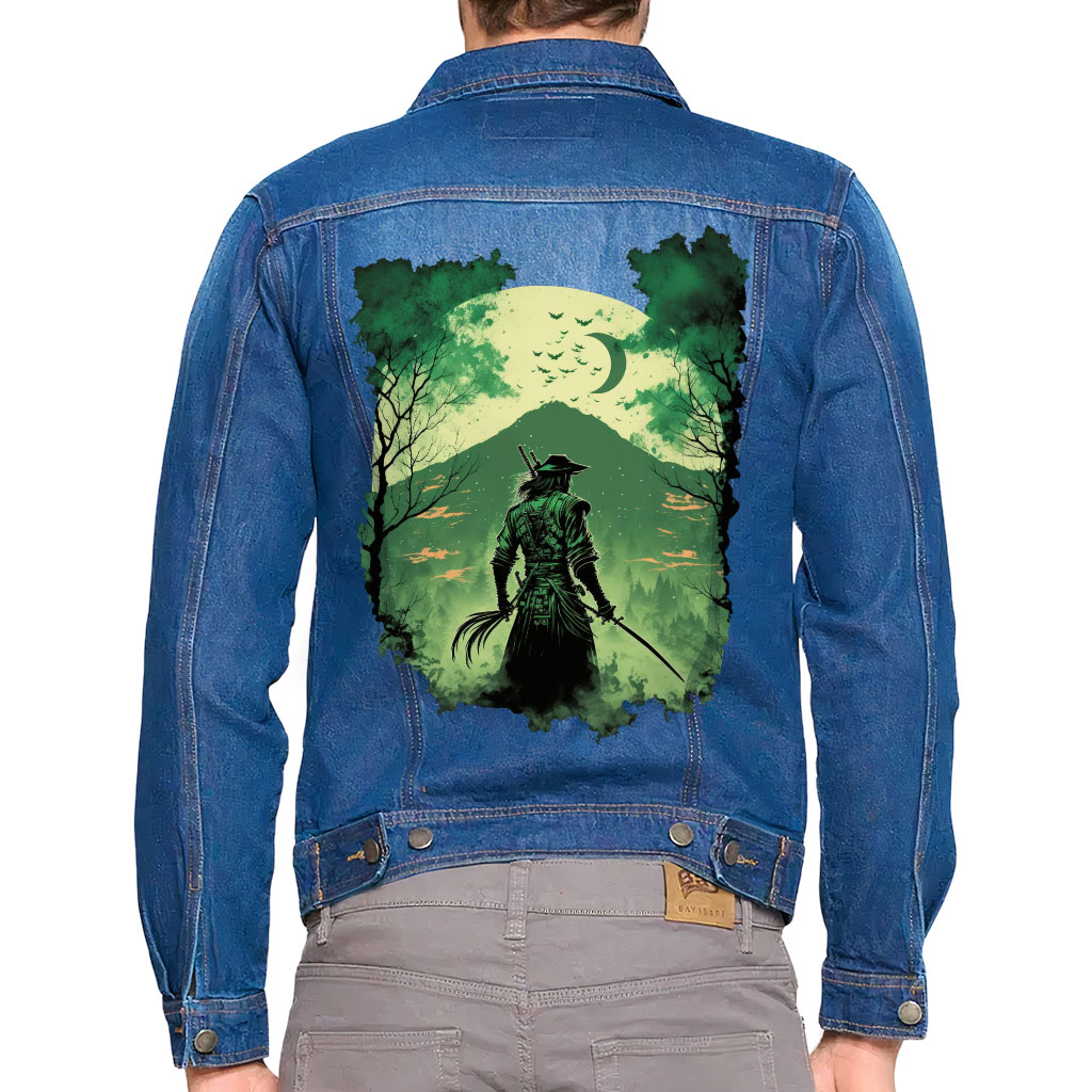 Samurai Art Dark Washed Men’s Denim Jacket – Landscape Denim Jacket – Cool Graphic Jacket for Men