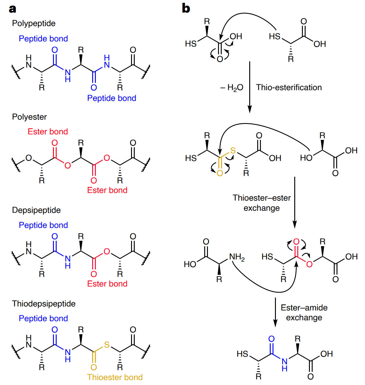 Peptide bonds are formed catalytically. The bond linkages via which polypeptides, polyesters, depsipeptides and thiodepsipeptides are formed. (CREDIT: Nature Chemistry)