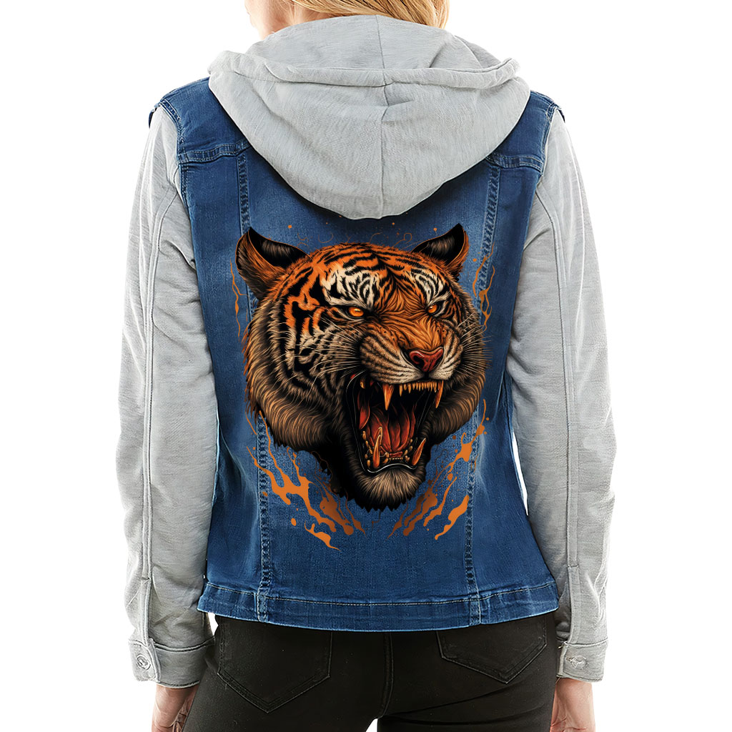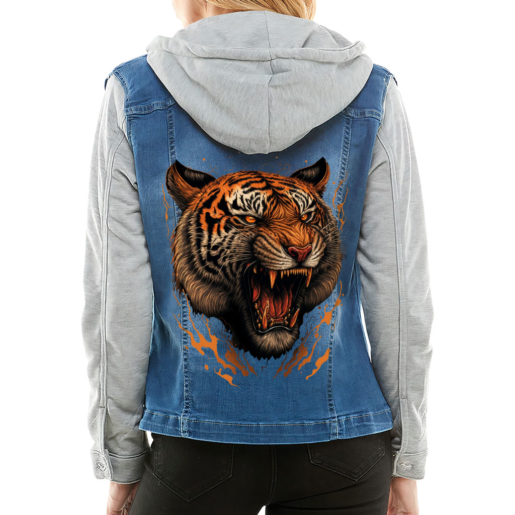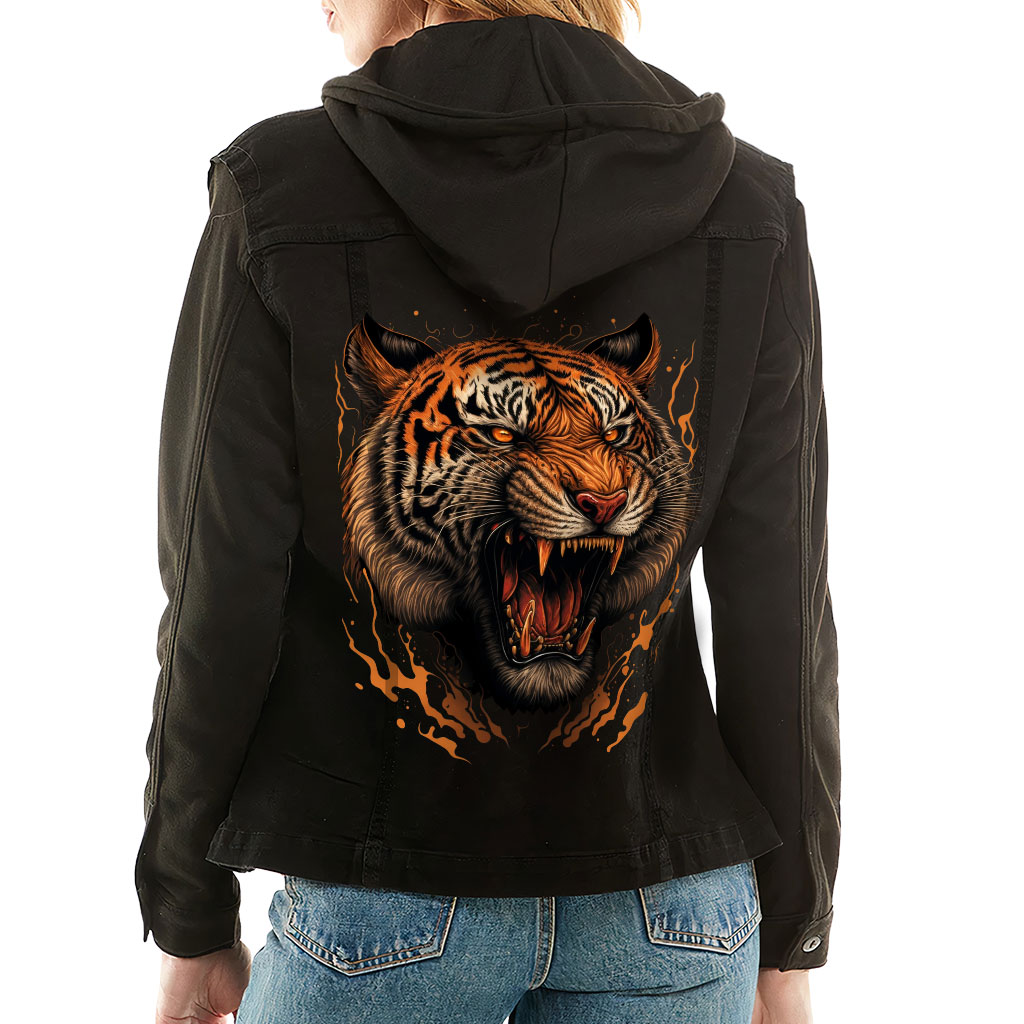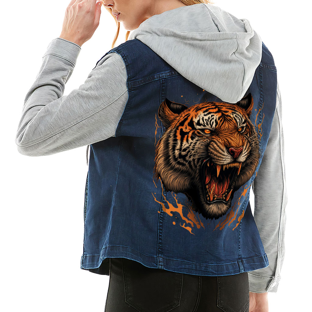 Tiger Face Ladies Denim Jacket with Fleece Hoodie