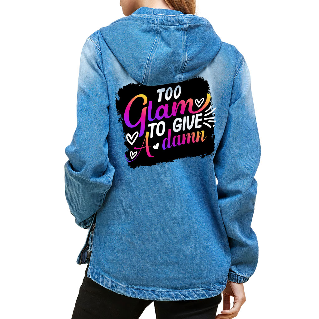 Too Glam to Give a Damn Women’s Denim Jacket with Hoodie – Cool Ladies Denim Jacket – Trendy Denim Jacket