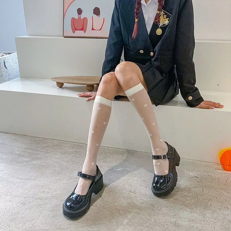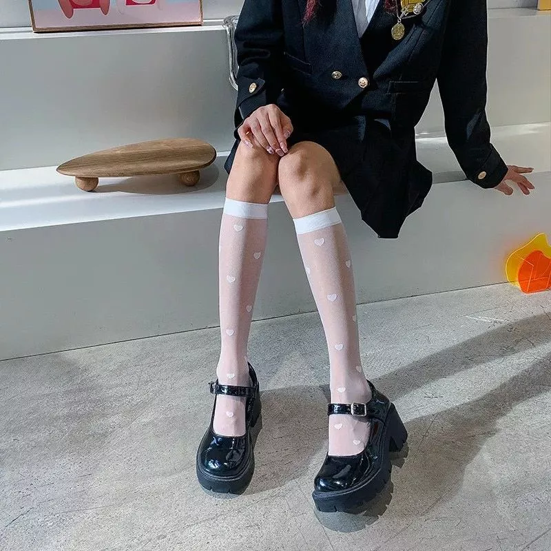 Elevate your style game with our Sheer Love Knee Socks, a mesmerizing blend of sophistication and allure. Crafted from luxurious nylon, these stockings boast a delicate see-through design adorned with charming love heart patterns, adding a touch of romance to any outfit.
